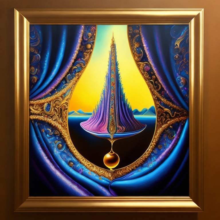 A surreal framed painting depicting an ornate window opening to a fantastical landscape with a spire, boats, and vibrant colors.