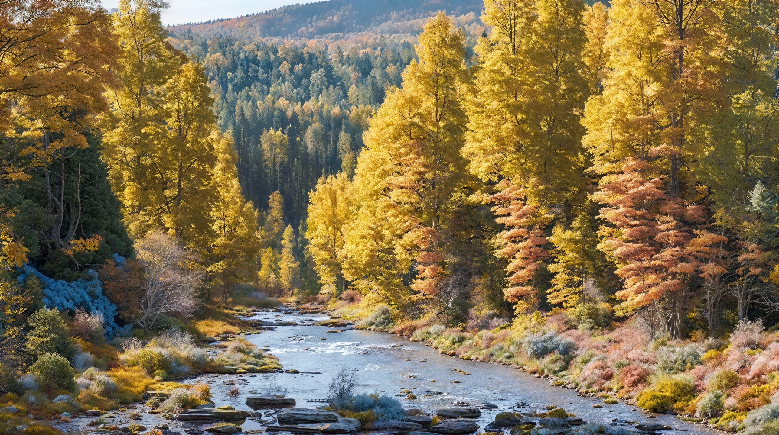 A beautiful landscape photograph of a river flowing through a lush forest during autumn, creating a vivid and colorful scene. The river, positioned centrally, meanders from the foreground into the midground, its surface reflecting the subtle light. The riverbanks are lined with a mixture of dark green and light blue-