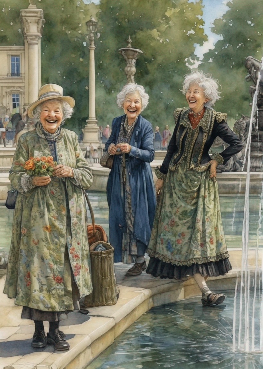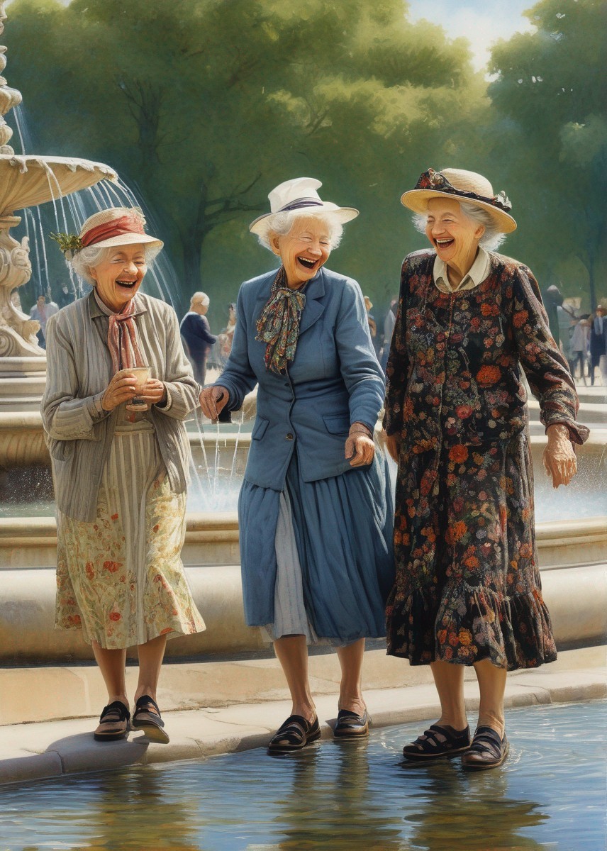 Three elderly women are laughing together by a fountain on a sunny day, radiating joy and friendship.