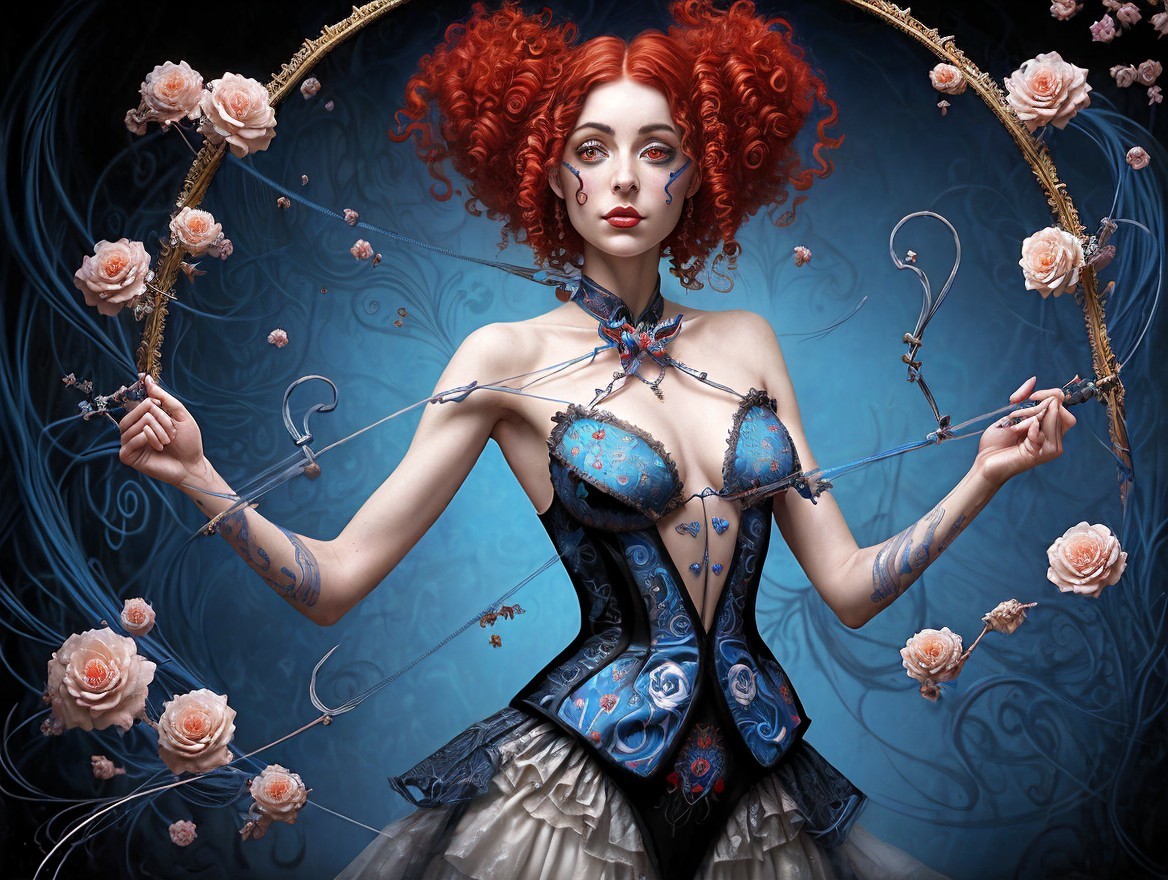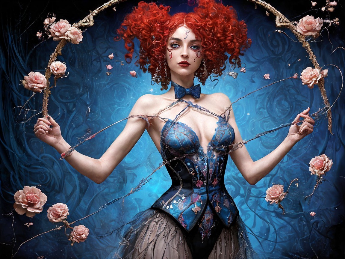 A whimsical character with bold red hair and striking makeup poses gracefully. Clad in a blue outfit adorned with playful designs, she is surrounded by roses and hearts in a vibrant blue background.