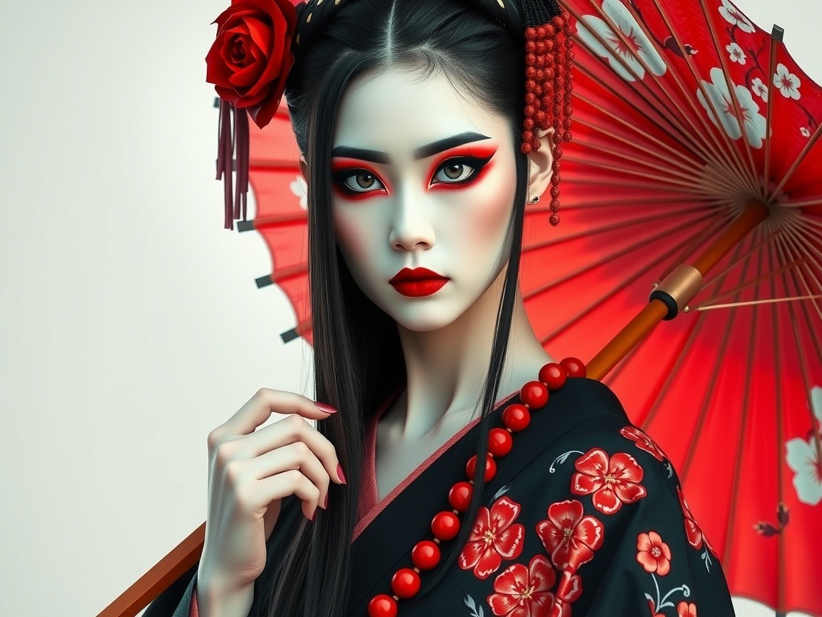 Prompt: "Create an image of a striking figure embodying traditional Japanese aesthetics. The subject is a woman with porcelain skin, accentuating her otherworldly beauty. She has long, straight black hair, elegantly styled, with intricate decorations including a deep red rose and black hairpins. Her facial makeup is bold and dramatic, featuring stark white skin, deep crimson lips, and heavy dark eye makeup with red accents and sharp lines, creating an intense gaze with golden eyes.