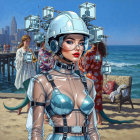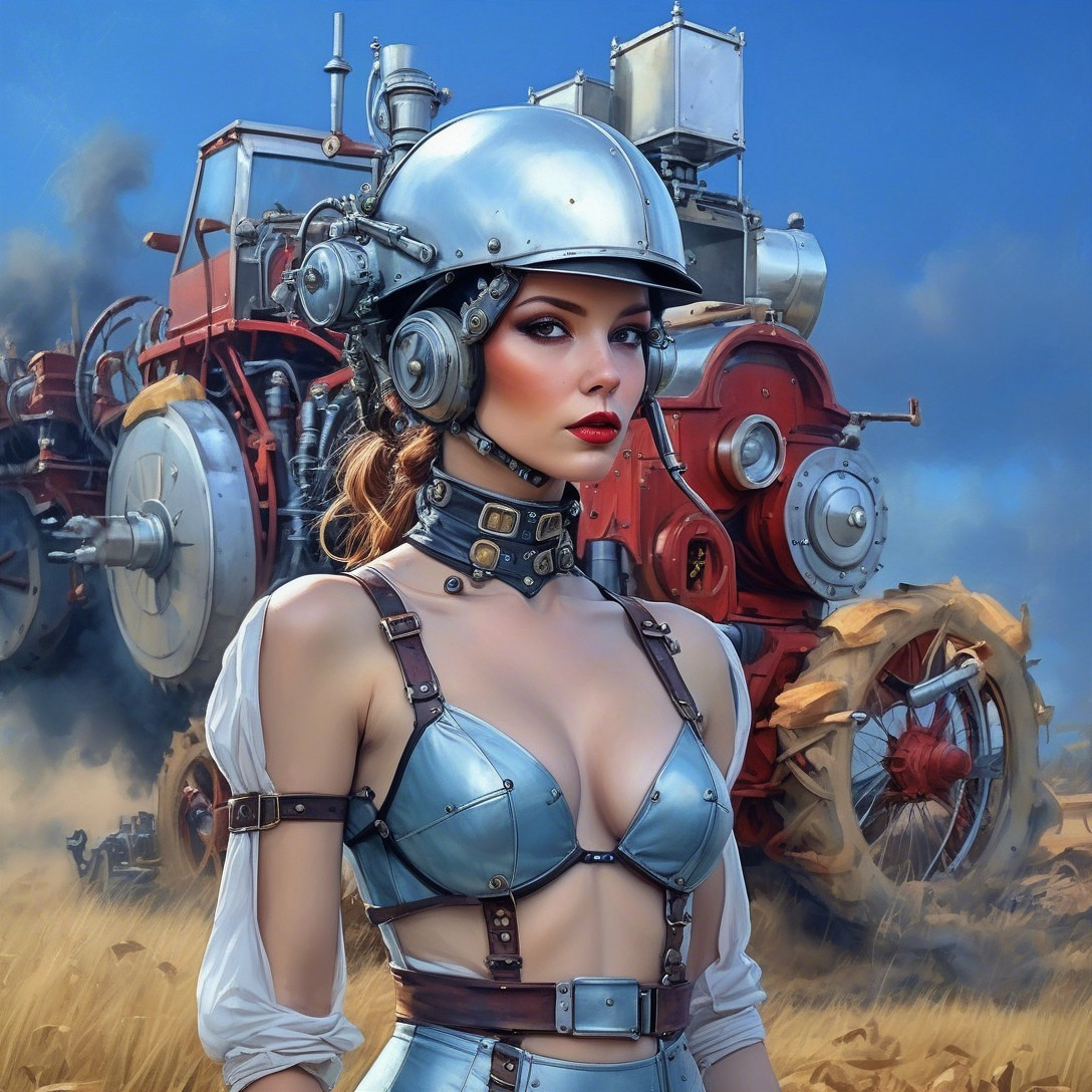 A stunning steampunk woman with long dark-red hair, wearing an intricate helmet, a black and silver studded choker, brown leather straps, and an armored silver bra, stands in a field of wheat with a large, red, steampunk-style tractor behind her. The woman has a delicate face, with
