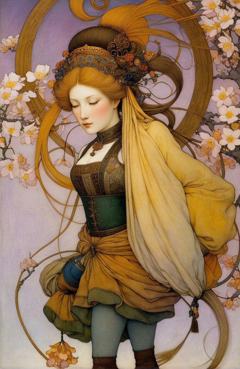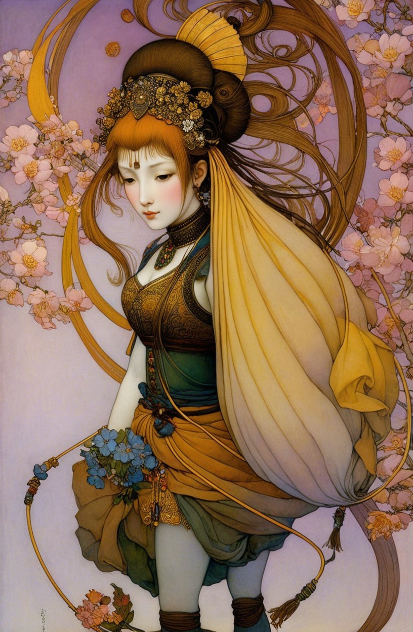A graceful figure in a flowing gown plays a flute, surrounded by blooming flowers. Her serene expression and ornate jewelry evoke a sense of harmony and beauty in a dreamlike setting.