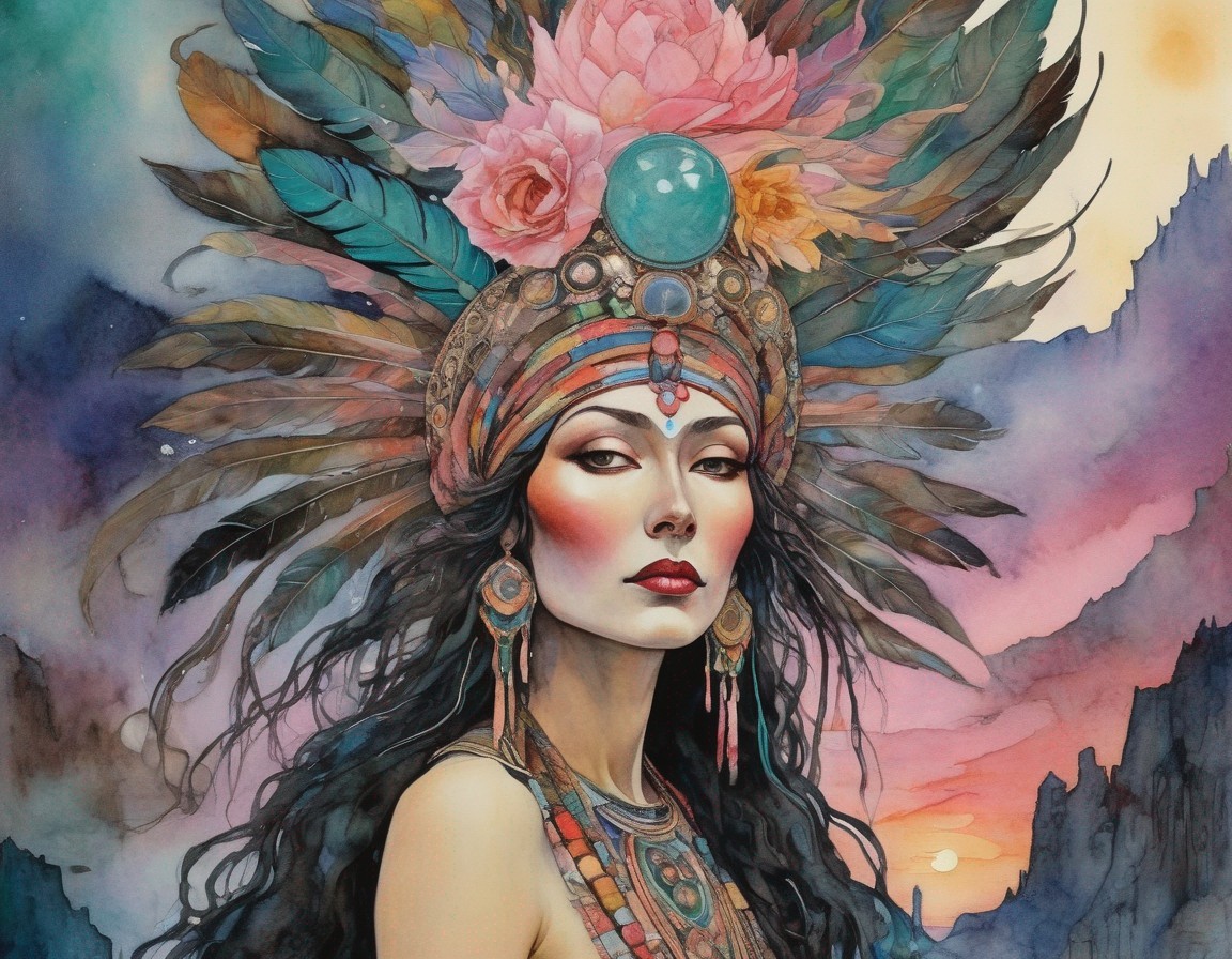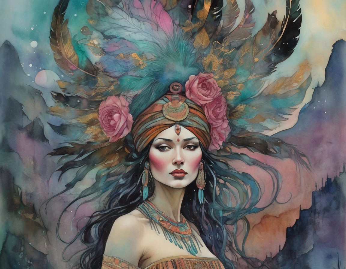 Prompt: A full colored painting of a beautiful shaman woman emerging from the twilight wearing an elaborate magical turban, whimsical, beautiful, poignant, colors rose, gold, pink, jade, black.
