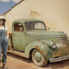A young woman stands in front of a vintage green truck, wearing a white shirt and denim overalls, with a wide-brimmed hat. The backdrop features weathered walls and tall grass under a blue sky.