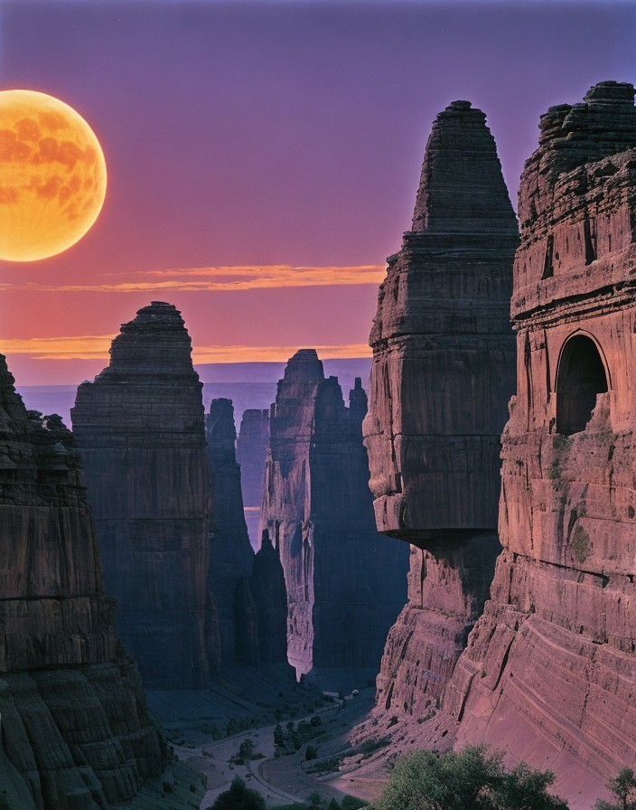 Prompt: "a Valley on and alien world with many carved giant humanoid alien faces, with wide open mouths carved into the stone walls of the Valley. the stone faces are huge, sphinx like and carved clearly into the walls of the valley. in the : art naïf , art brut, by Ernest Gendron, Philippe Druilet"
