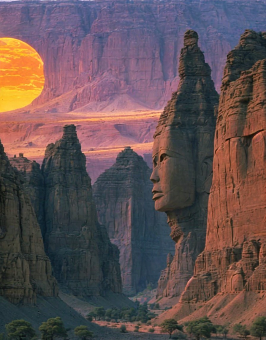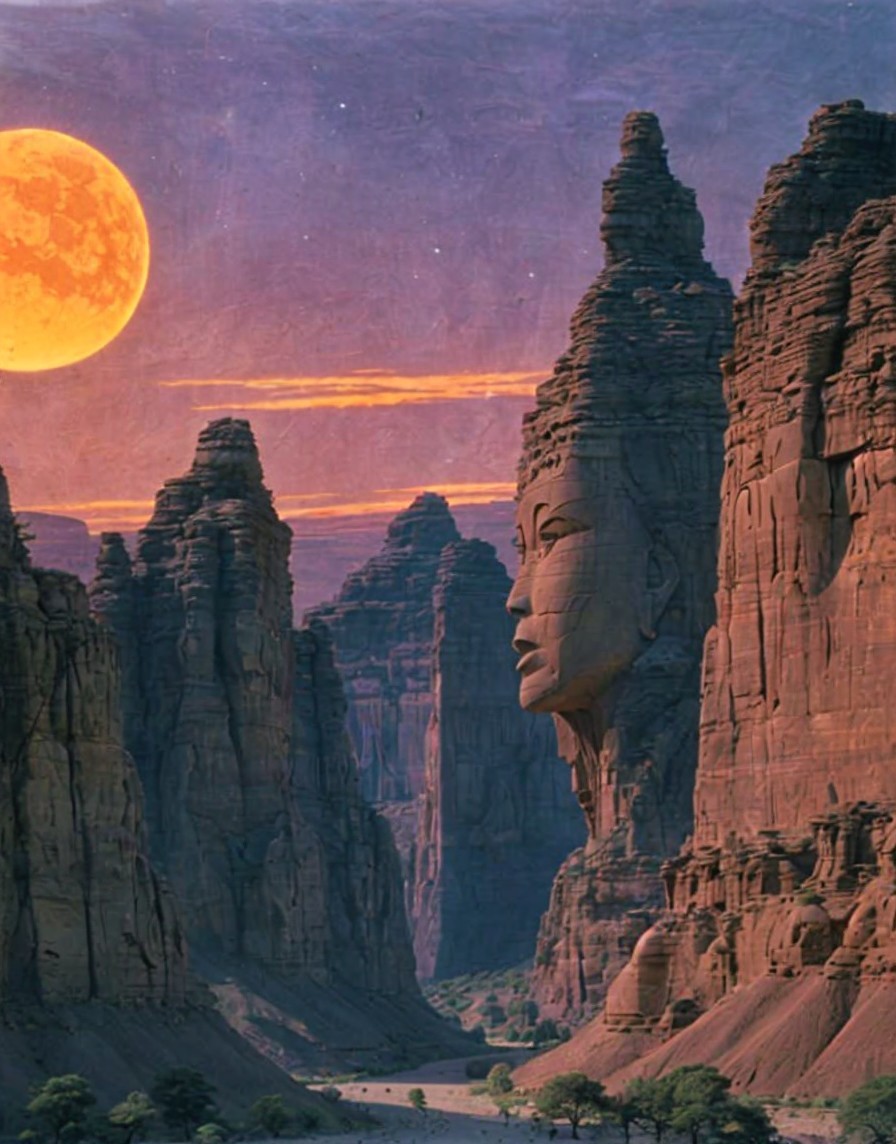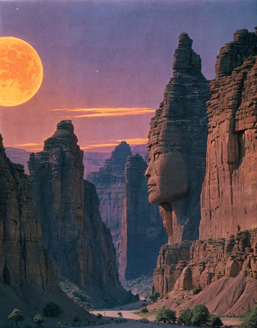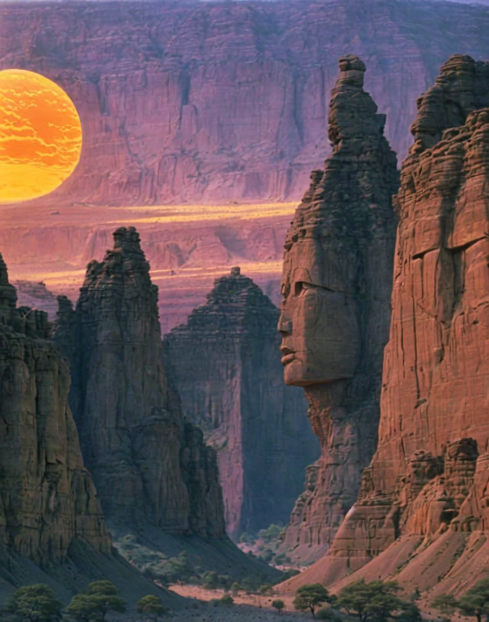 Prompt: a Valley on and alien world with many carved giant humanoid alien faces, with wide open mouths carved into the stone walls of the Valley. the stone faces are huge, sphinx like and carved clearly into the walls of the valley. in the : art naïf , art brut, by Ernest Gendron, Philippe Druilet