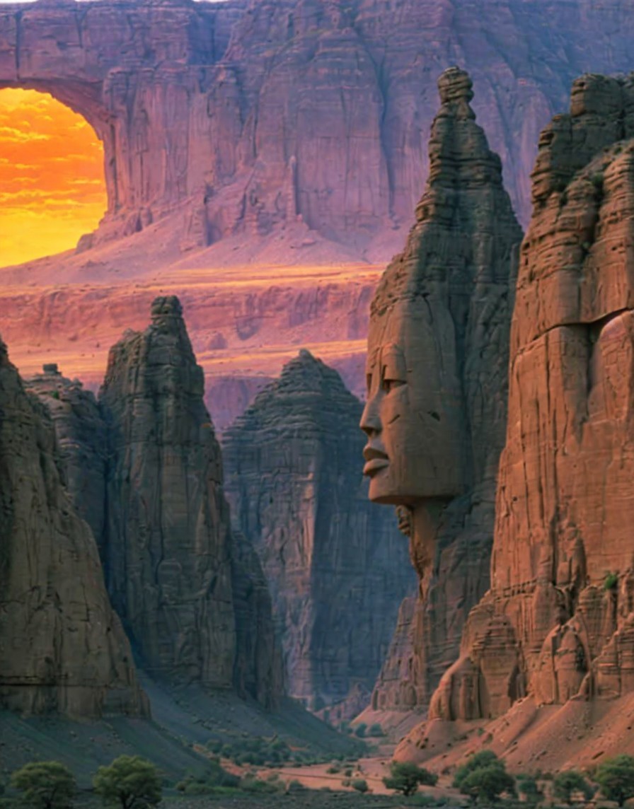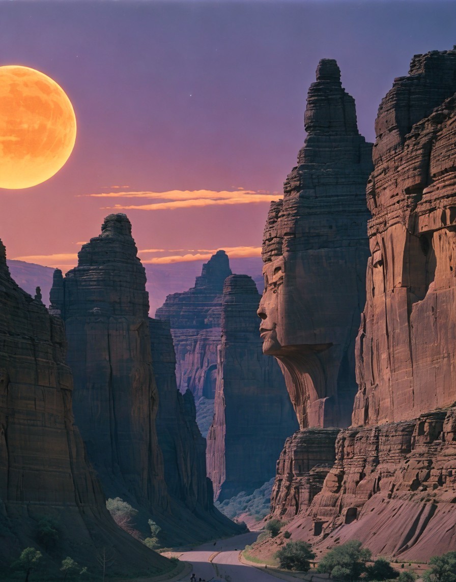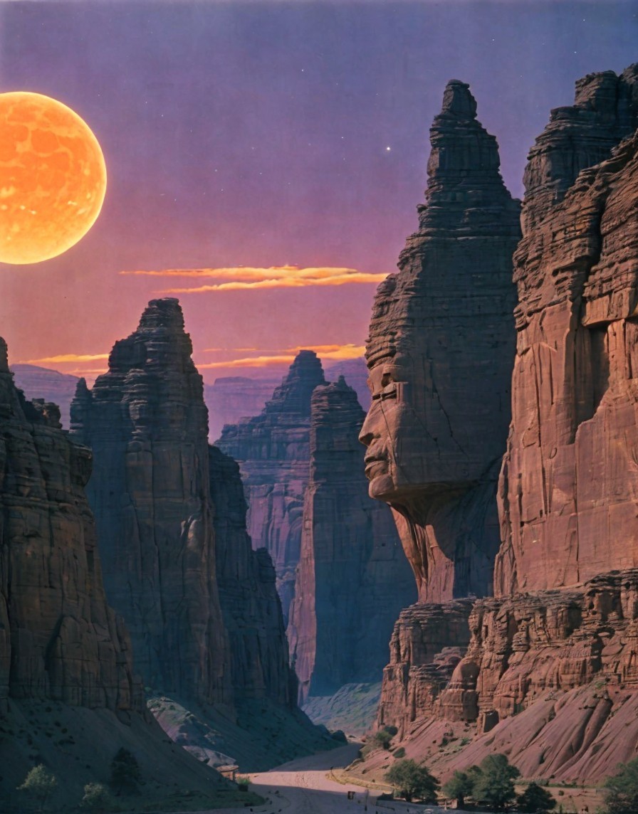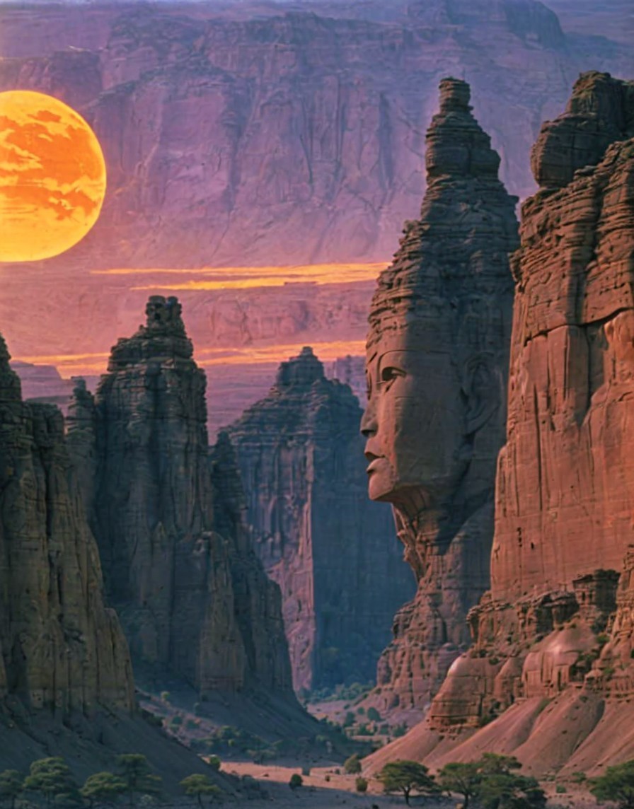 Prompt: a Valley on and alien world with many carved giant humanoid alien faces, with wide open mouths carved into the stone walls of the Valley. the stone faces are huge, sphinx like and carved clearly into the walls of the valley. in the : art naïf , art brut, by Ernest Gendron, Philippe Druilet