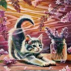 A fluffy kitten with striking blue eyes playfully lounges among vibrant pink blossoms, surrounded by delicate branches and a jar of flowers, creating a charming springtime scene.