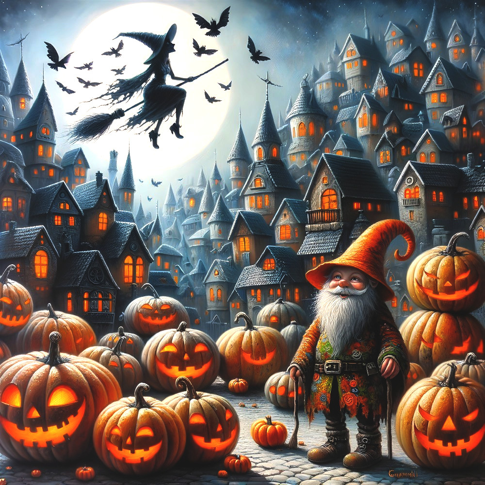 A whimsical Halloween scene features a smiling gnome in a colorful outfit standing among carved pumpkins. A witch flies overhead against a full moon, with spooky, enchanted houses in the background.