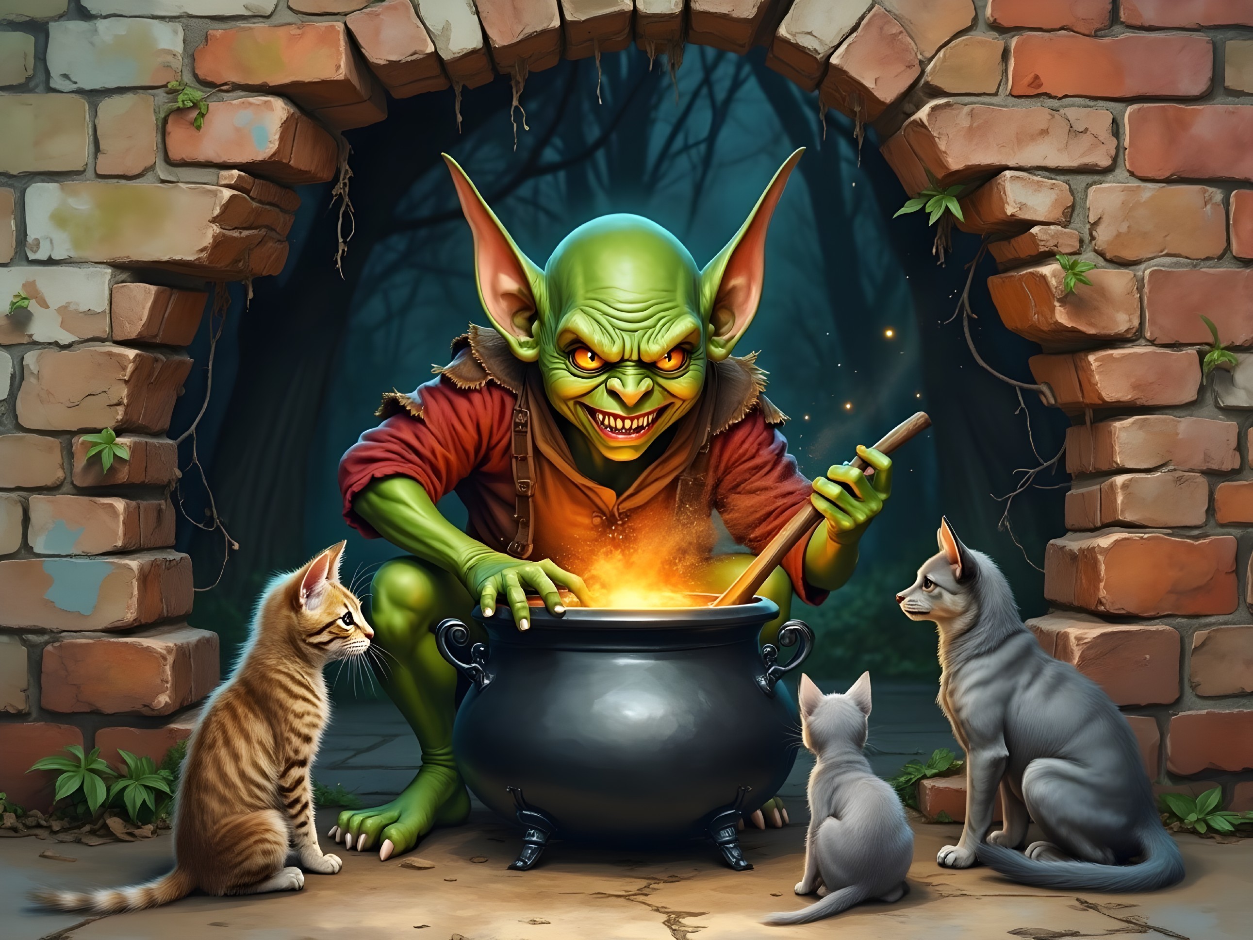 A mischievous green goblin stirs a glowing cauldron, surrounded by curious cats. The scene is set in a mystical, dimly lit stone archway, enhancing the eerie atmosphere.