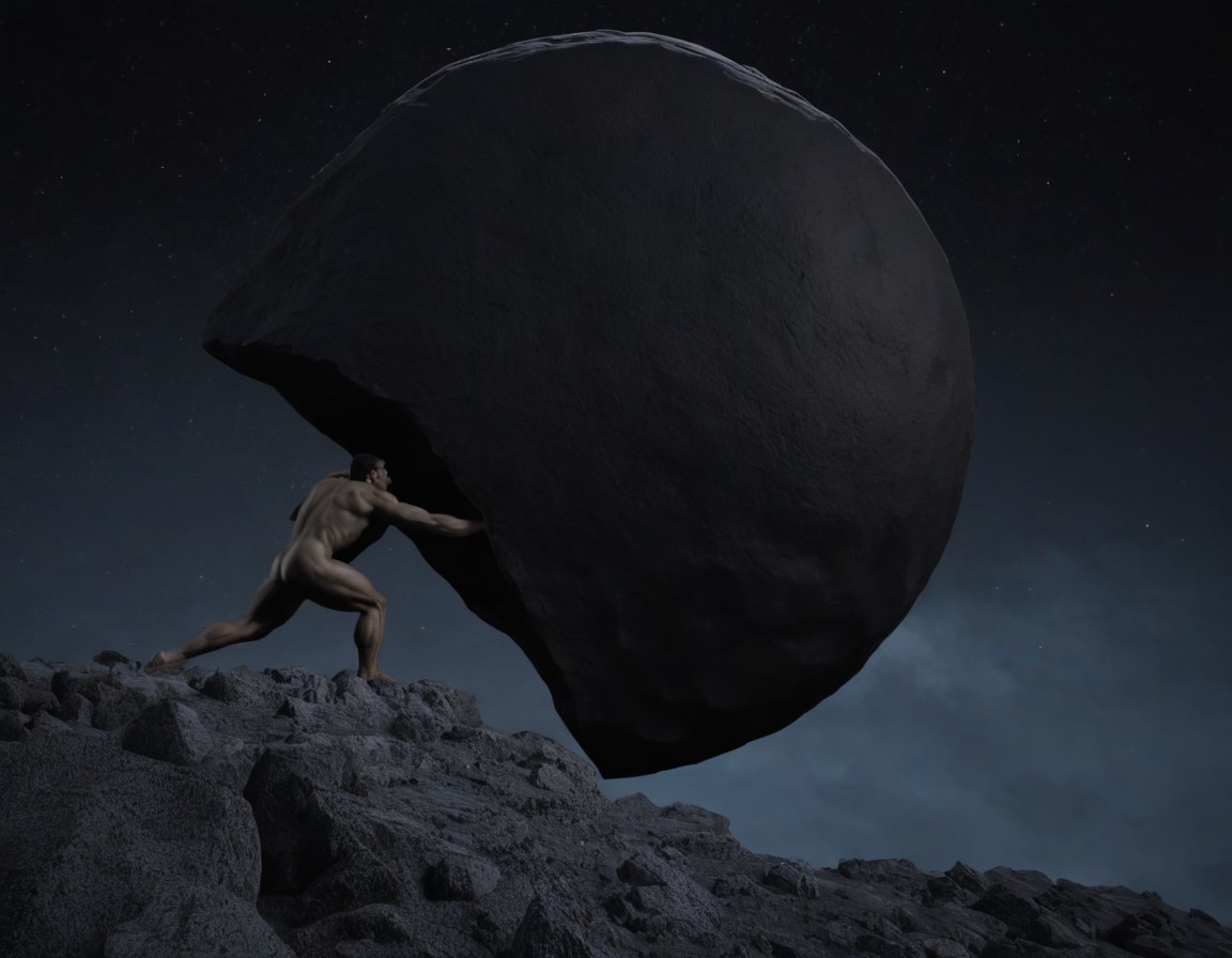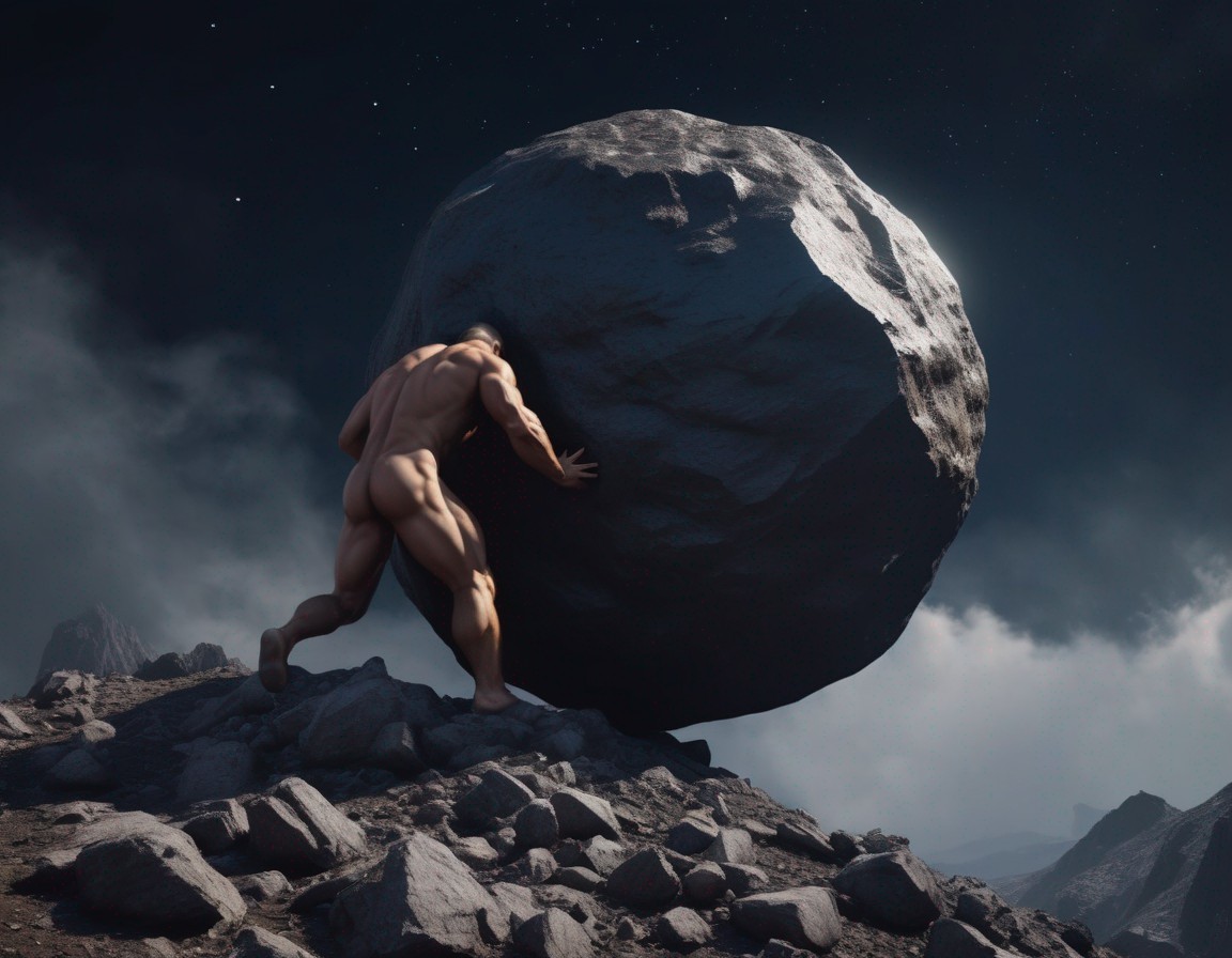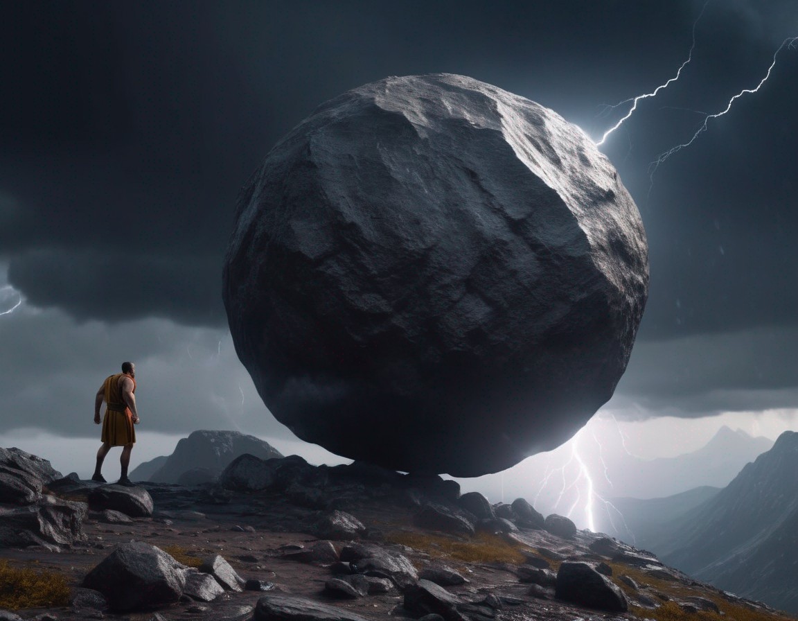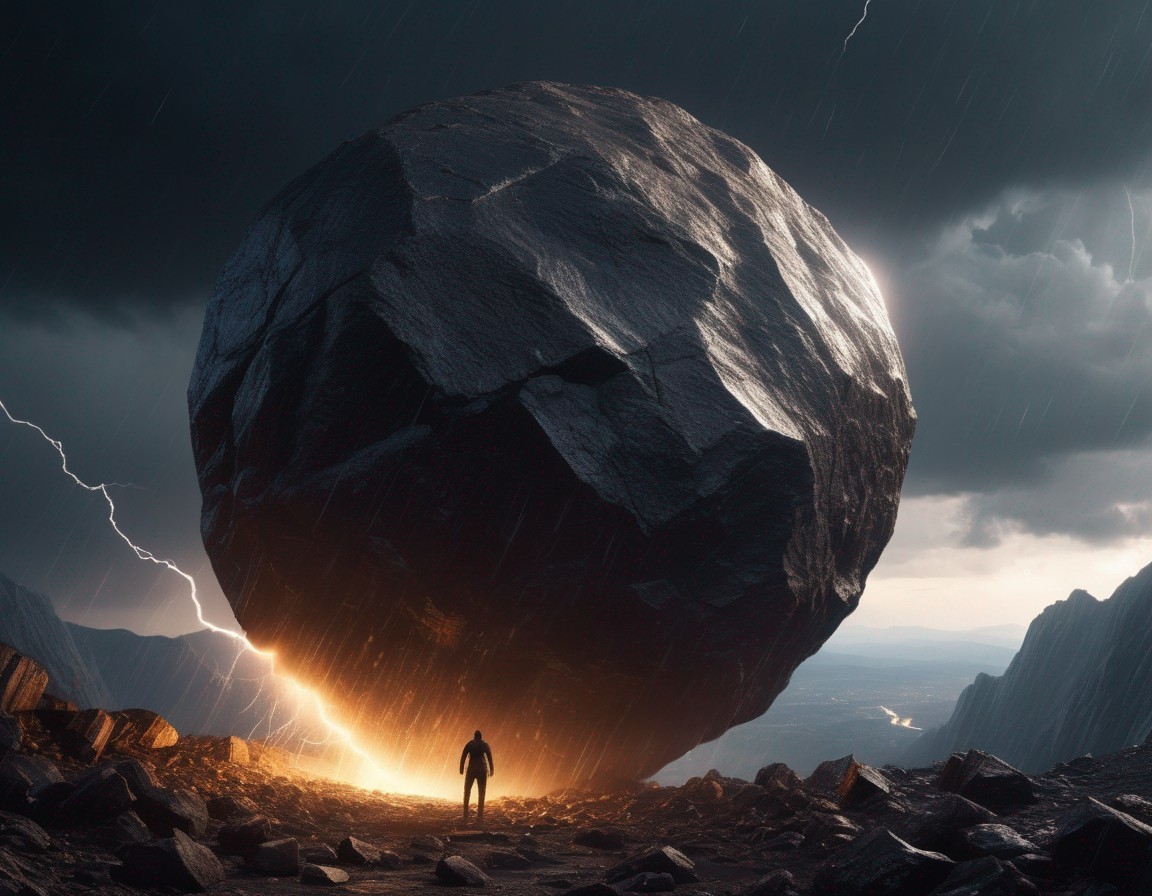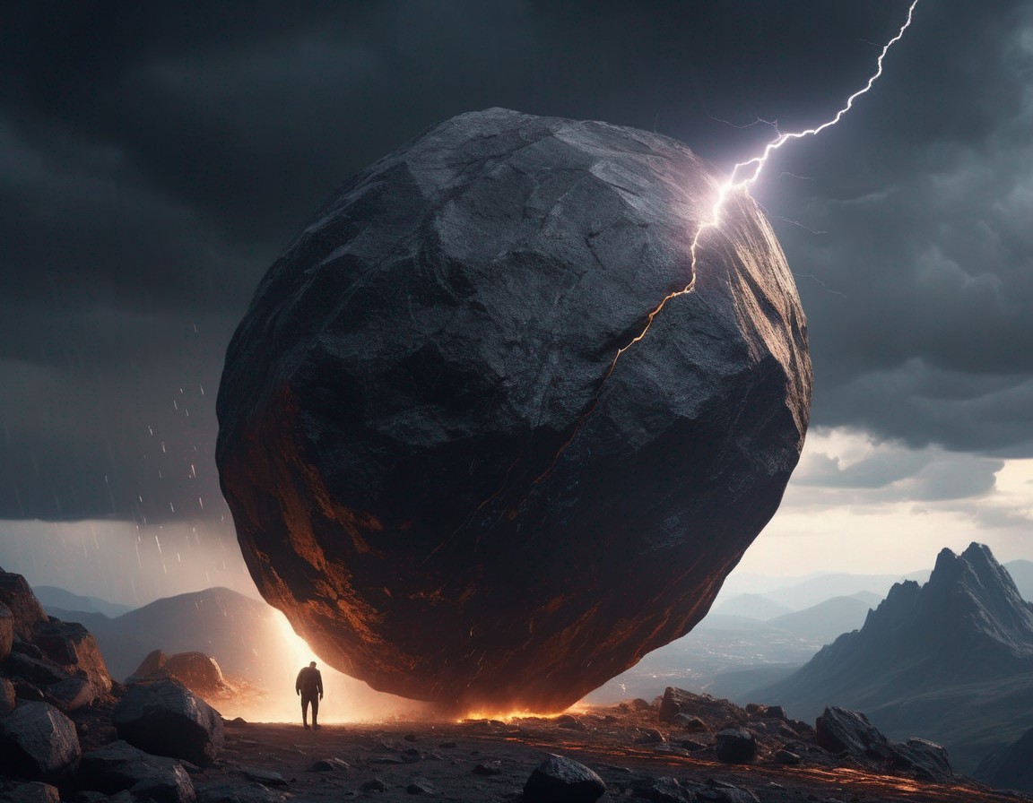 A person stands before a massive, glowing, levitating rock amidst a stormy mountain landscape, evoking a sense of mystic power.