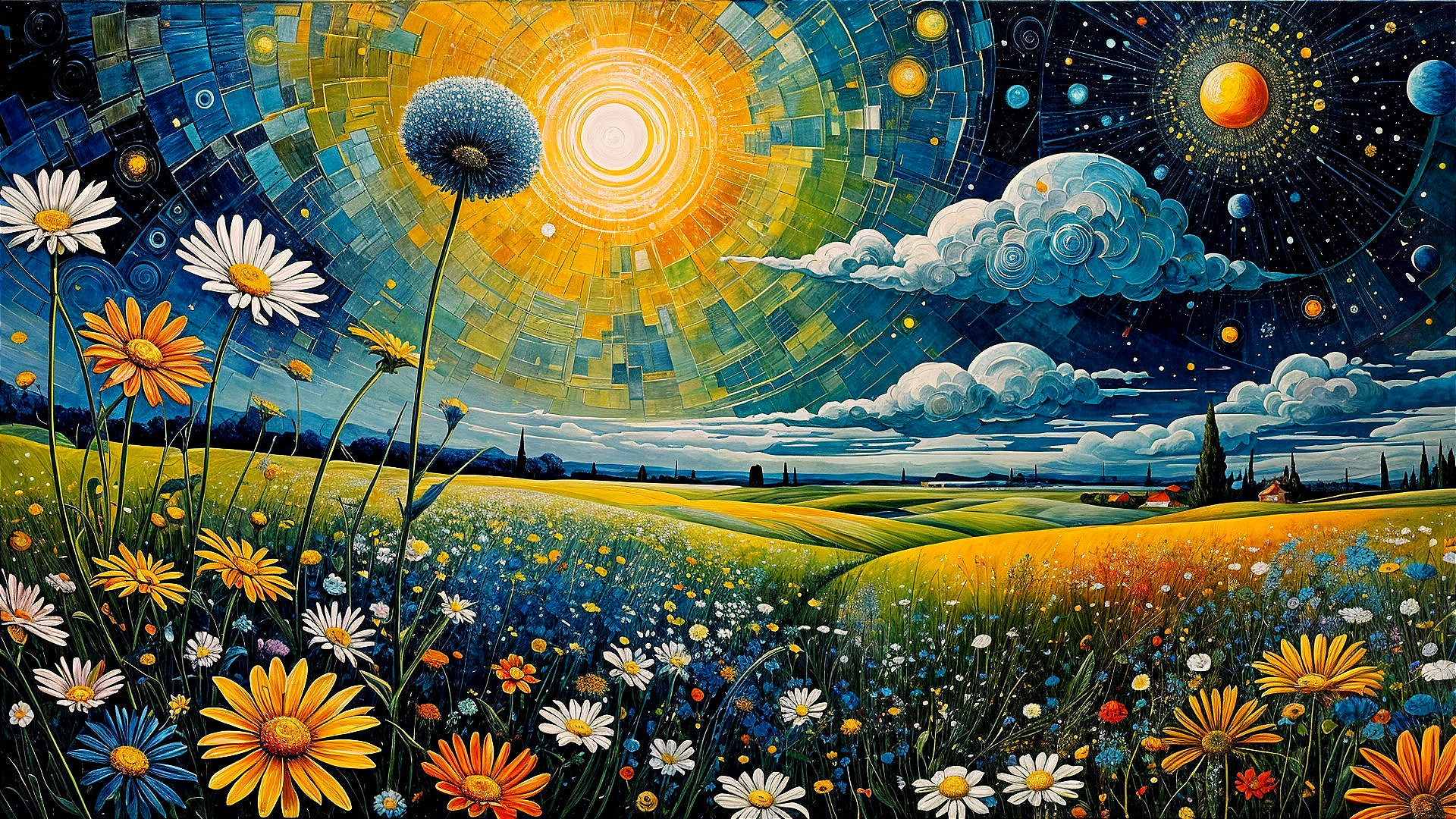 A painting of a vibrant, surreal landscape, resembling a stained-glass window. In the foreground, a field of colorful wildflowers stretches across the bottom of the image, with prominent daisies in white, orange, and blue hues. The central part of the image depicts rolling hills in shades of green and yellow