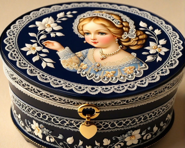 A beautifully crafted black wooden box adorned with intricate floral patterns and a vivid depiction of two figures in traditional attire, surrounded by elegant gold detailing and a natural background.
