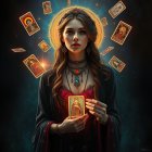 A serene woman in a regal dark gown holds an icon, surrounded by glowing tarot cards. Her ornate jewelry and halo create a mystical atmosphere, blending spirituality with elegance.