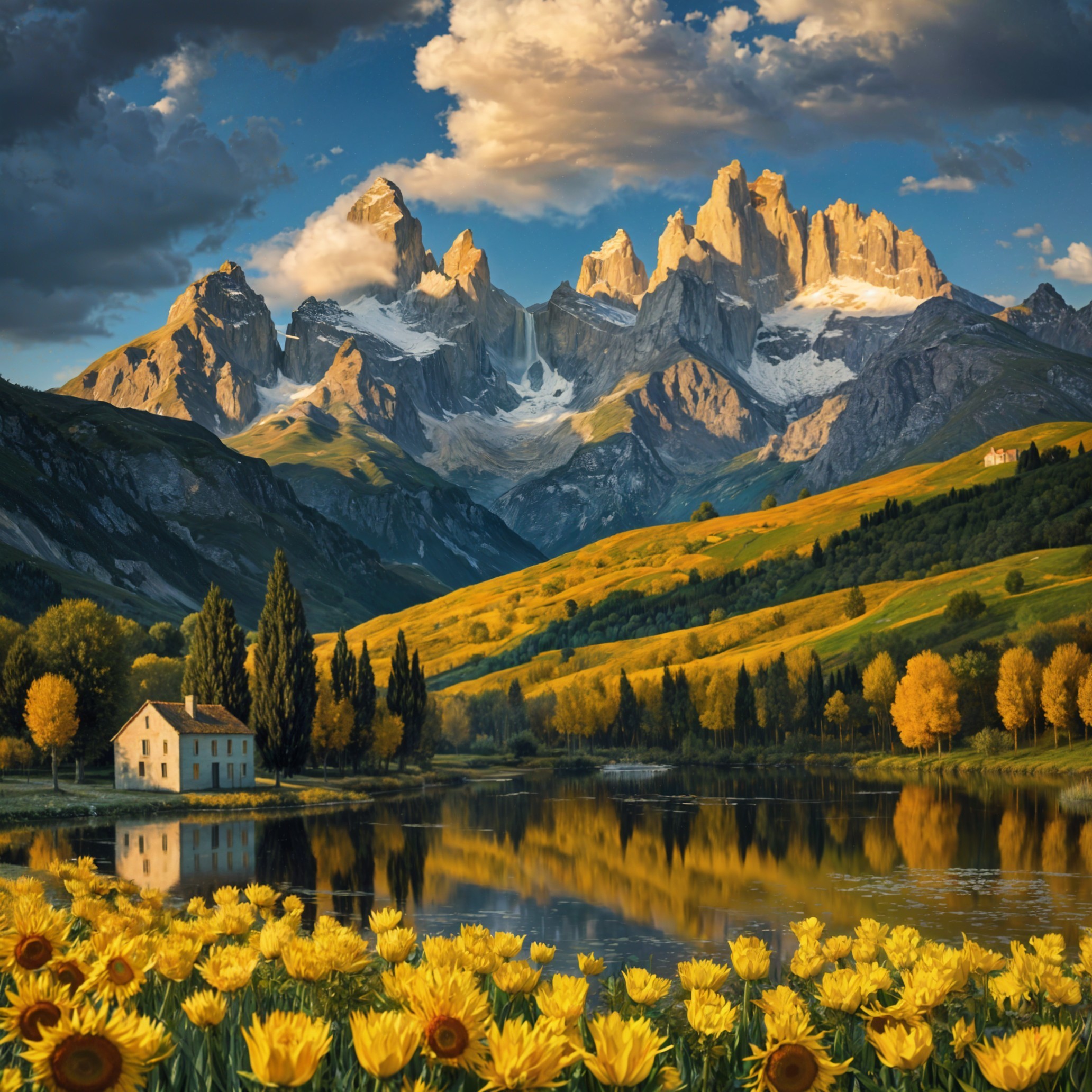 A landscape inspired by Northern Italy with sunflowers in the foreground, a tranquil lake, and a quaint house, with mountains like the Dolomites and dramatic clouds in the background.