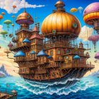A whimsical scene features a grand airship floating above a serene harbor, surrounded by colorful hot air balloons. A well-dressed figure stands on a wooden pier, admiring the fantastical view.