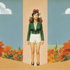 A girl stands confidently in a vibrant landscape, flanked by orange trees under a blue sky. She wears a green jacket with a furry collar and shorts, creating a striking contrast in the serene setting.