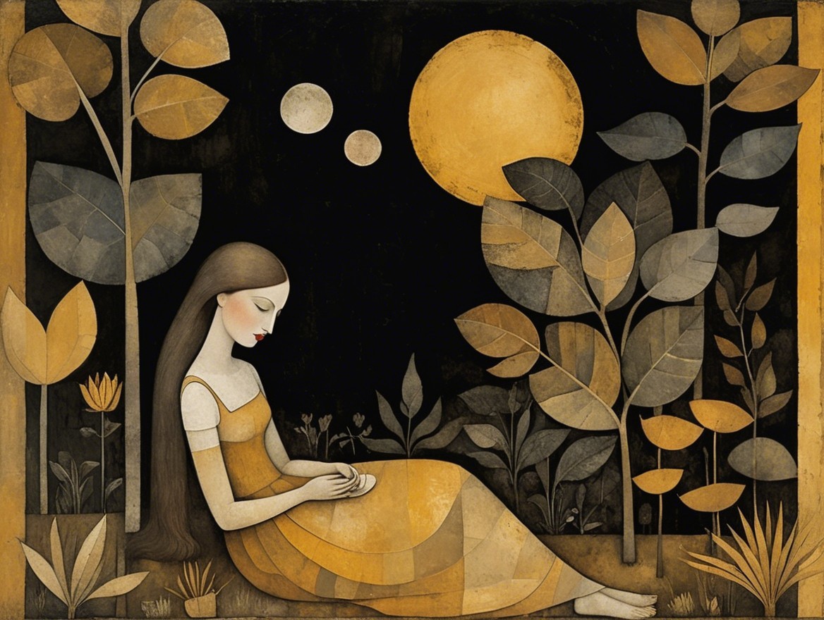 A serene portrait of a young woman with soft features, framed by stylized leaves. She wears a golden yellow dress, set against a dark, textured background, creating an aura of calm beauty.