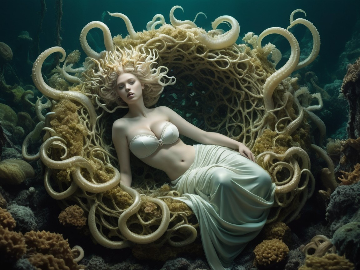 Prompt: A young, buxom and voluptuous woman in toga, recombent within a sea anenome nest. Frills, gills and tentacles.