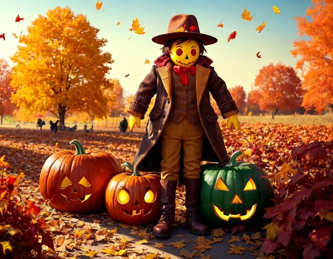 Cheerful Scarecrow Surrounded by Colorful Autumn Leaves