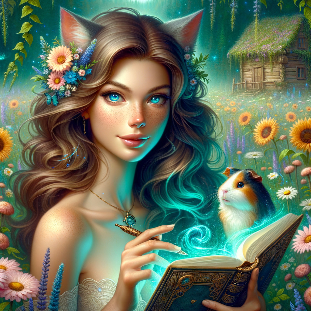 A fantasy portrait of a woman adorned with a floral crown and a cat's ears, holding a book, with a guinea pig and glowing orbs, set in a pastoral backdrop.