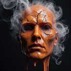 The image features a vibrant mask with a glossy, orange surface resembling honeycomb patterns. Wisps of smoke swirl around it, adding an ethereal quality to the striking, artistic piece.