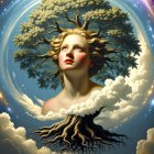 A serene young woman with flowing hair entwined with trees and flowers emerges against a vibrant sky, embodying nature and beauty in a dreamlike, ethereal landscape.