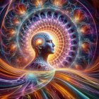 A serene identity stands with closed eyes, radiating vibrant cosmic patterns. Ethereal light and intricate mandala motifs create a mesmerizing backdrop, symbolizing spiritual exploration and inner peace.