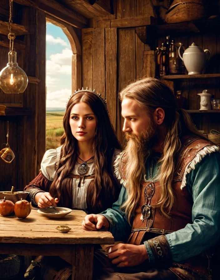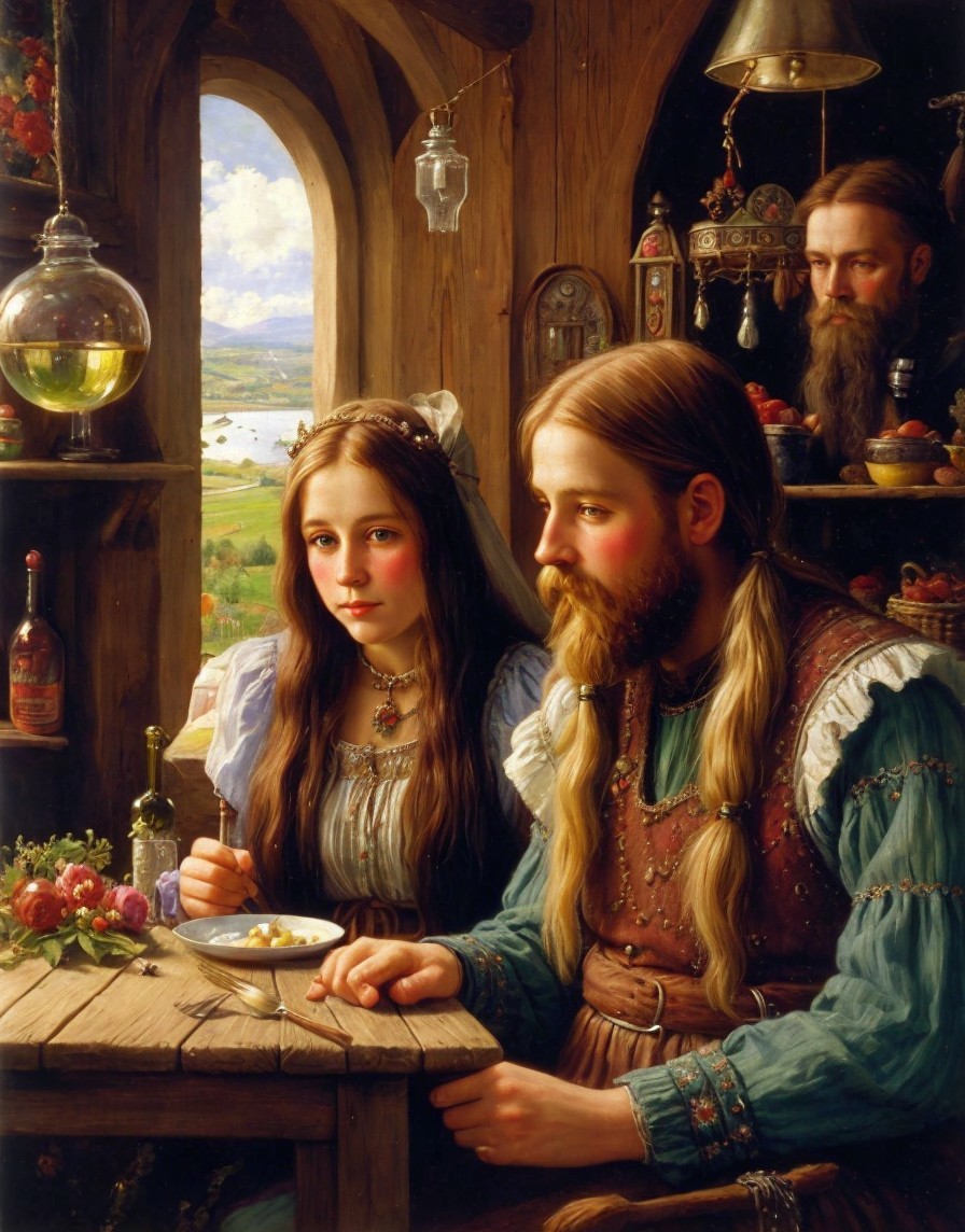 A painting depicts two individuals with braided hair in ornate medieval attire, gazing solemnly beside a window with flowers and glass trinkets.