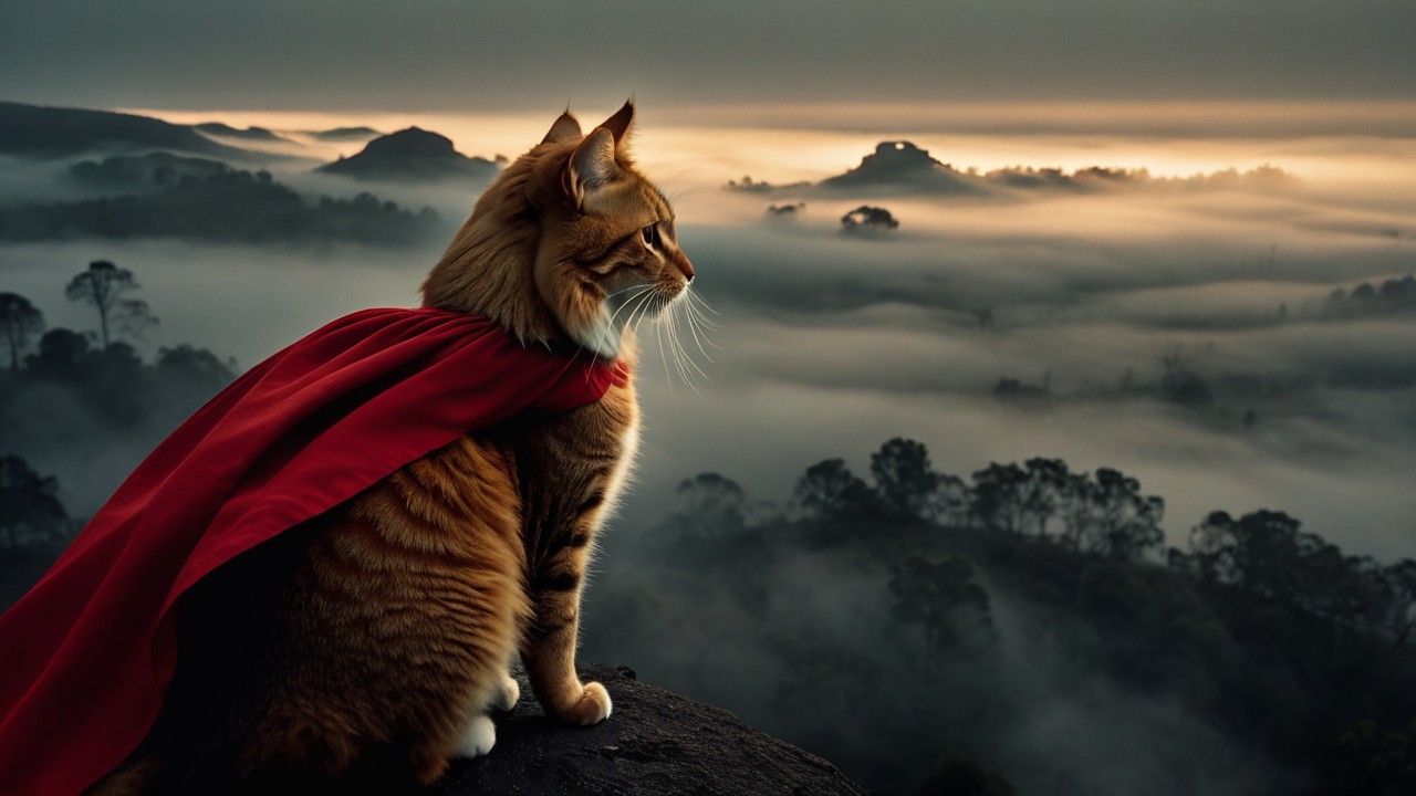 A majestic cat with a flowing red cape sits on a rocky ledge, gazing over a misty landscape filled with rolling fog and distant castles, evoking a sense of adventure and mystery.