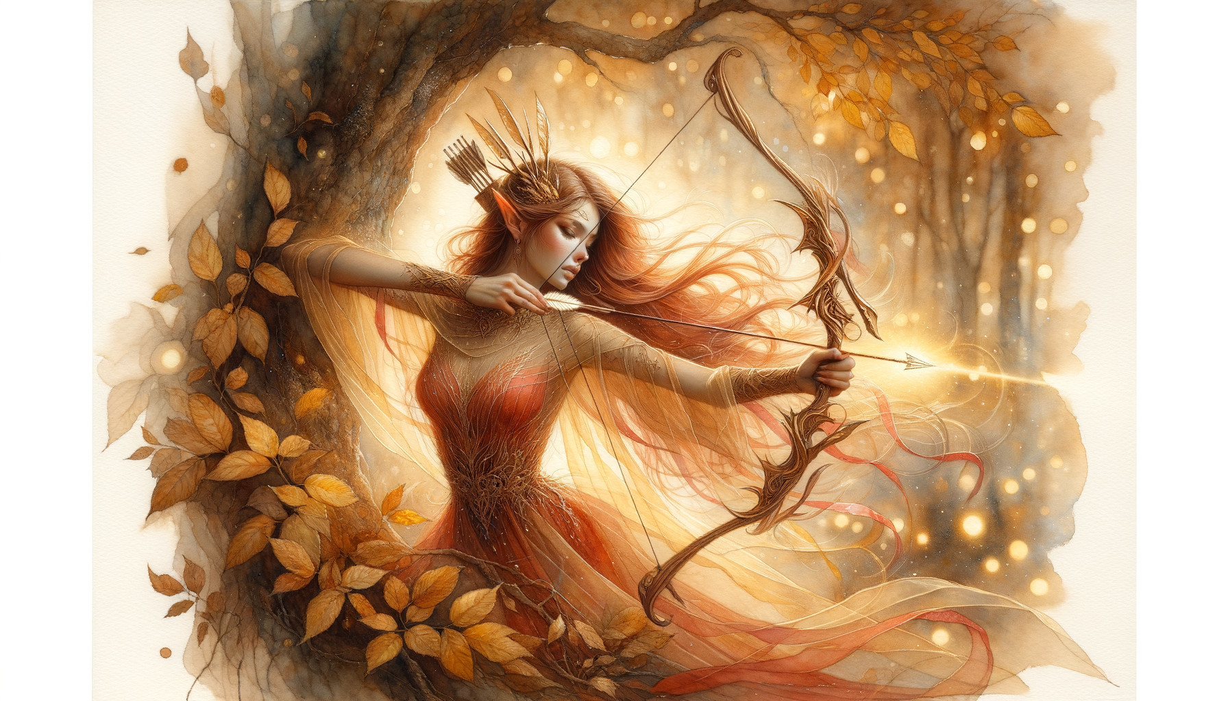 Paint a dreamy soft mesmerizing watercolour painting depicting an ethereal beautiful elven huntress crouching in a tree canopy with long windswept red gold hair dressed in a transparent gossamer red gold magnificent dress, wearing a hunter’s cowl, holding a intricate detailed enchanted elven bow, arrow made of light notched in the bow, hyperrealism, in focus, against a warm, sunlit, golden brown bokeh background that suggests an autumn forest. The elven bow contrast sharply with the soft-focus forest backdrop. The foreground is blurred, featuring patches of yellow and brown fallen leaves that match the seasonally warm color palette. Suffused with soft, glowing light, especially noticeable on the tips of the petals and leaves, giving the impression of a tranquil, late afternoon sunlight filtering through the trees.
