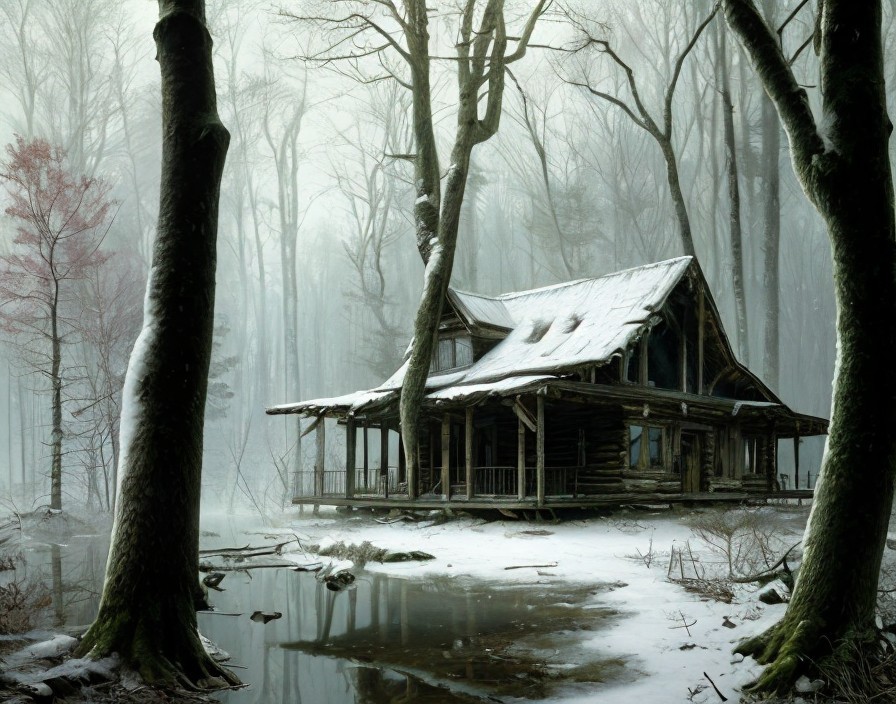 Prompt: "a serene yet haunting depiction of an abandoned log cabin in the spring forest, trees stripped of their leaves, early spring, melty snow, light fog, ethereal quality, mystical tale, mysterious allure, still and reflective, wilderness, nature's untouched and mysterious corners; wet brush effect, intricate, by John Atkinson Grimshaw, by Gerald Brom, by Ivan Bilibin"