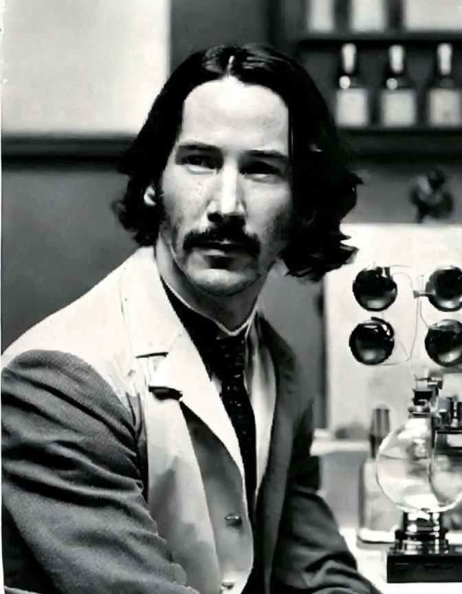 Prompt: "Young Keanu reeves reid as a chemist doppelgänger circa 1920 sitting at a desk, daguerreotype photography, science fiction elements, retrofuturistic, retrofuturism, technology, working room with desk and blackboard, working"