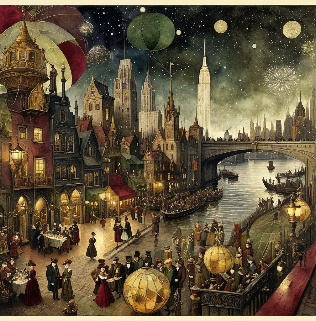 New York vintage New Year’s Eve fantasy party,, 3rd century European miniature art. Velvet Black, Shabby, Dull Gold, olive green, burgundy, Golden Ratio, Surreal Fantasy, Elegant, High Definition Ultra Fine 3D Line, Zenangle Style, Watercolor Patchwork , Arthur Rackham Style, Paul Kidby, Gediminas Prankevicius, Jacek Jerka, Extremely Detailed, Intricate, Thoughtful, HDR, Fractal, Beautiful, Award Winning, Fantasy Look, Fantasy, Crisp Quality