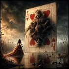 A mysterious queen emerges from a decorative frame against a dramatic coastal background. She wears a regal gown, a crown, and holds tarot cards, exuding dark elegance and intrigue.