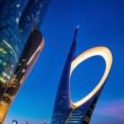 A dramatic skyline at dusk features a sleek, modern skyscraper with a distinctive circular window, alongside a tall, slender tower, all set against a backdrop of moody clouds.