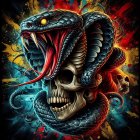 A fierce serpent-like creature with vibrant scales and fiery accents, sharp teeth, and an intense gaze. It emerges from a dark cavern, exuding a menacing aura and dynamic energy.