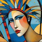 This vibrant painting features a stylized woman with dramatic features and colorful, feather-like hair, set against a geometric background of blues, yellows, and warm tones, exuding confidence and grace.