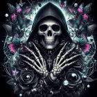 A cloaked figure with a skull face holds glowing jars, surrounded by vibrant foliage. Adorned with intricate jewelry, they exude an enigmatic, mystical aura in a dark, magical setting.