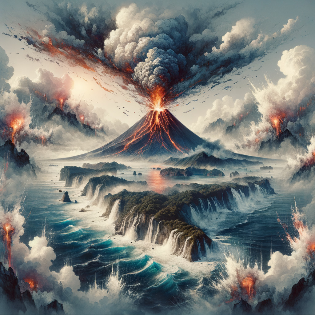 The image depicts a dramatic volcanic landscape with an erupting volcano in the center. Surrounding mountains and turbulent seas create a vibrant scene of nature's power and beauty.