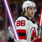 A dynamic ice hockey player stands confidently on the rink, wearing a sleek jersey with the number 86. The arena is bustling with fans, creating an electrifying atmosphere.