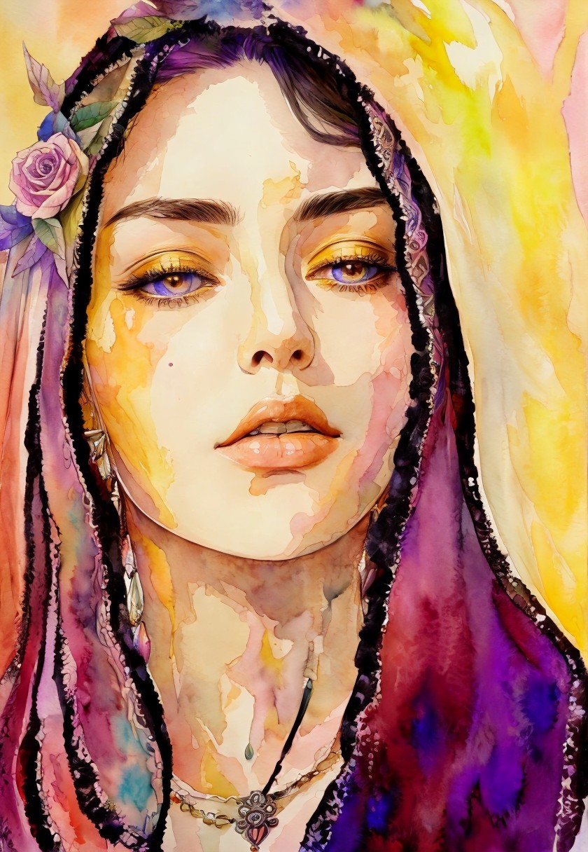 + Prompt:Mystical handsome priestess, watercolor and ink masterpiece, captivating upper body portrait with a shifted stacked-up perspective, detailed colored ink drawing, digital artwork featuring withered pale colors, intricately detailed in American Gothic style, enhanced by dimmed dynamic lighting and wavery textures and hues . The piece incorporates a traumacore theme with a triadic color scheme of yellow, ochre, and beige in an 8:11 ratio, creating a mesmerizing inkpunk ambiance. The background is a dark ochre with vivid illumination, surrounded by intricate details reminiscent of 1970s advertising art, all envisioned by Overton Loyd, showcasing watercolor details and a dynamic, moving pose. The style exudes a dreamy atmosphere with cinematic wash, grain, and luminous plasticity, enhanced by 3D effects and delicate coloring. octane render, anisotropic filtering, shadow mapping in 1.3 ratio, and volumetric lighting. The overall aesthetic is reminiscent of daguerreotype photography on old paper, blending elements of cinewash, traumacore, and mystical symbolism. The 1970s advertising art influence is evident in the composition, featuring soft rounded edges and a quilling, folded paper style in a 1.6 ratio, high coloring, plasticity in 1.9 ratio, ambient occlusion, UHD, HDR, HQ,