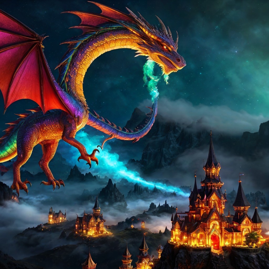 A vibrant, multicolored dragon breathes smoke above a mystical city at night. The scene is illuminated with glowing towers and an enchanting sky, creating a magical, fantastical atmosphere.