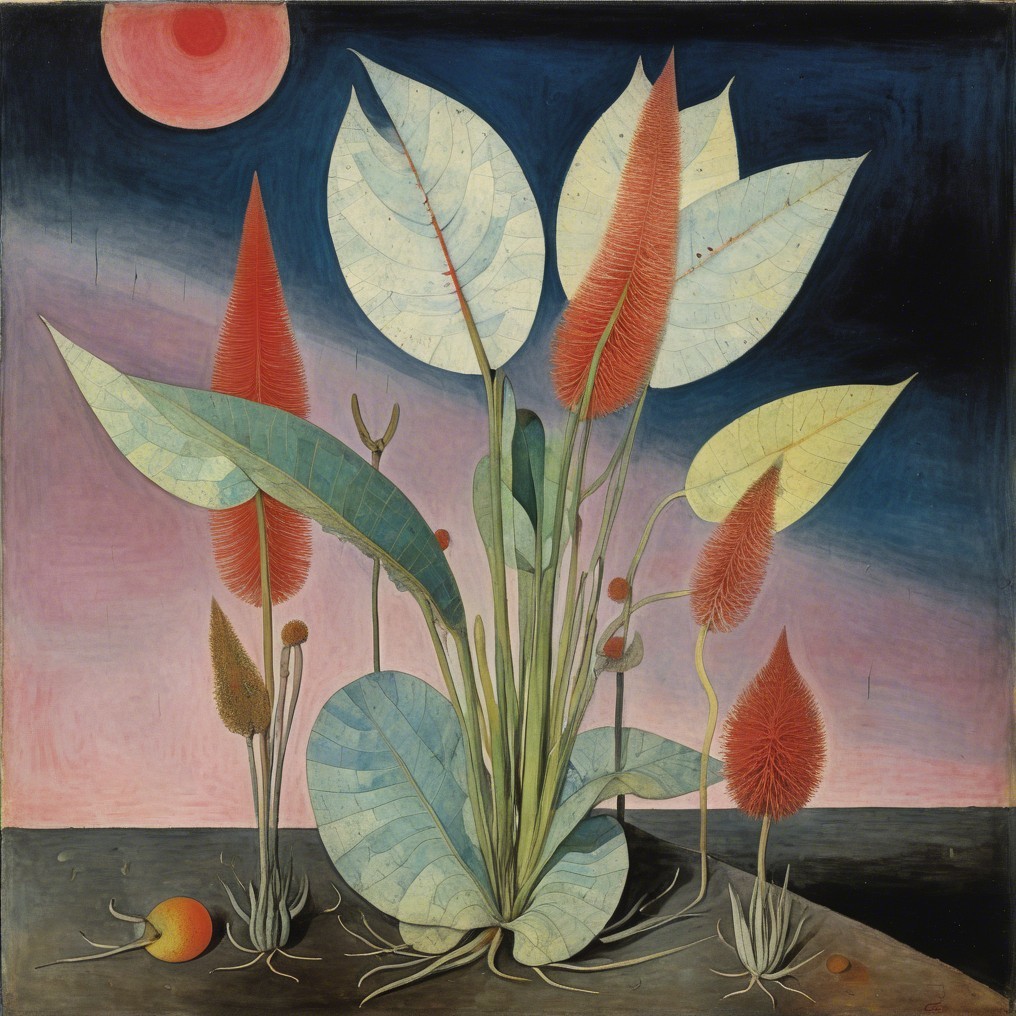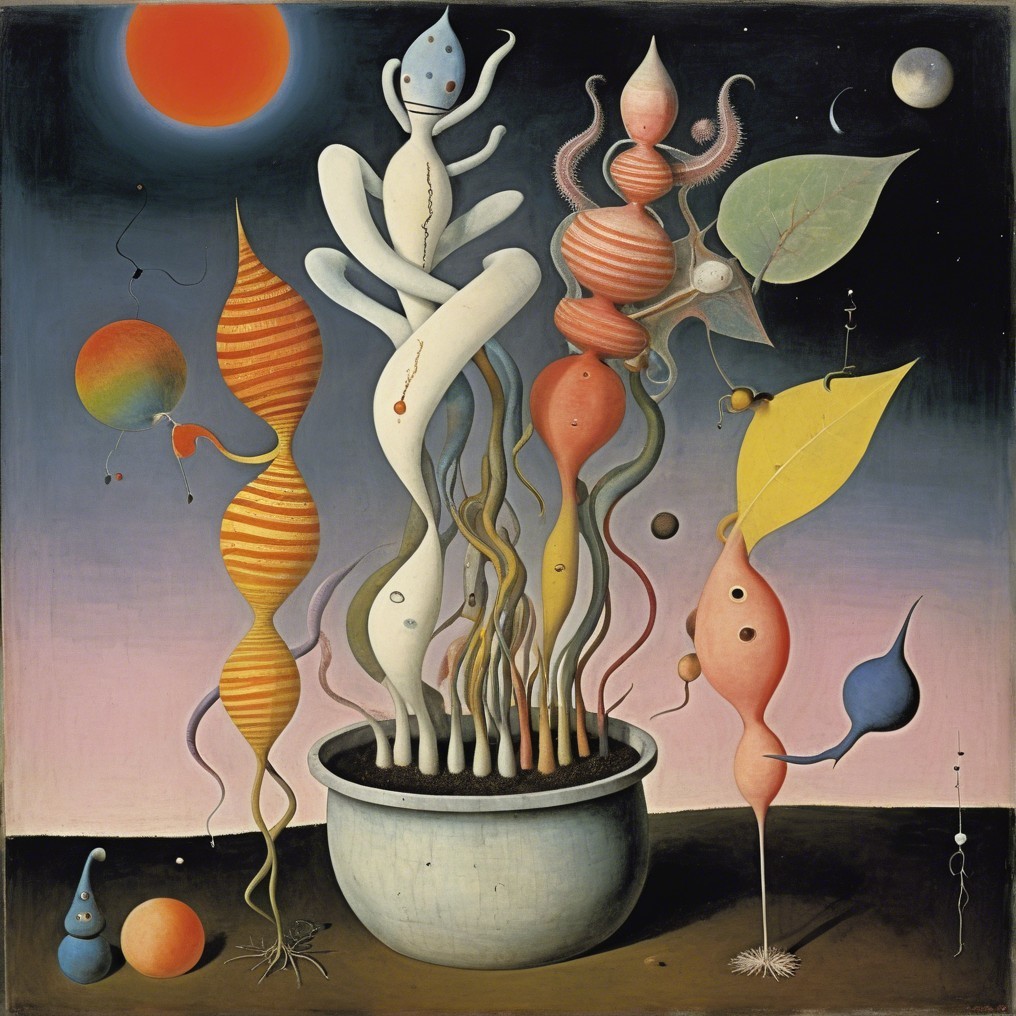 The artwork features surreal, anthropomorphic plants emerging from a pot, intertwined with DNA-like structures and vibrant colors against a dreamlike celestial backdrop.