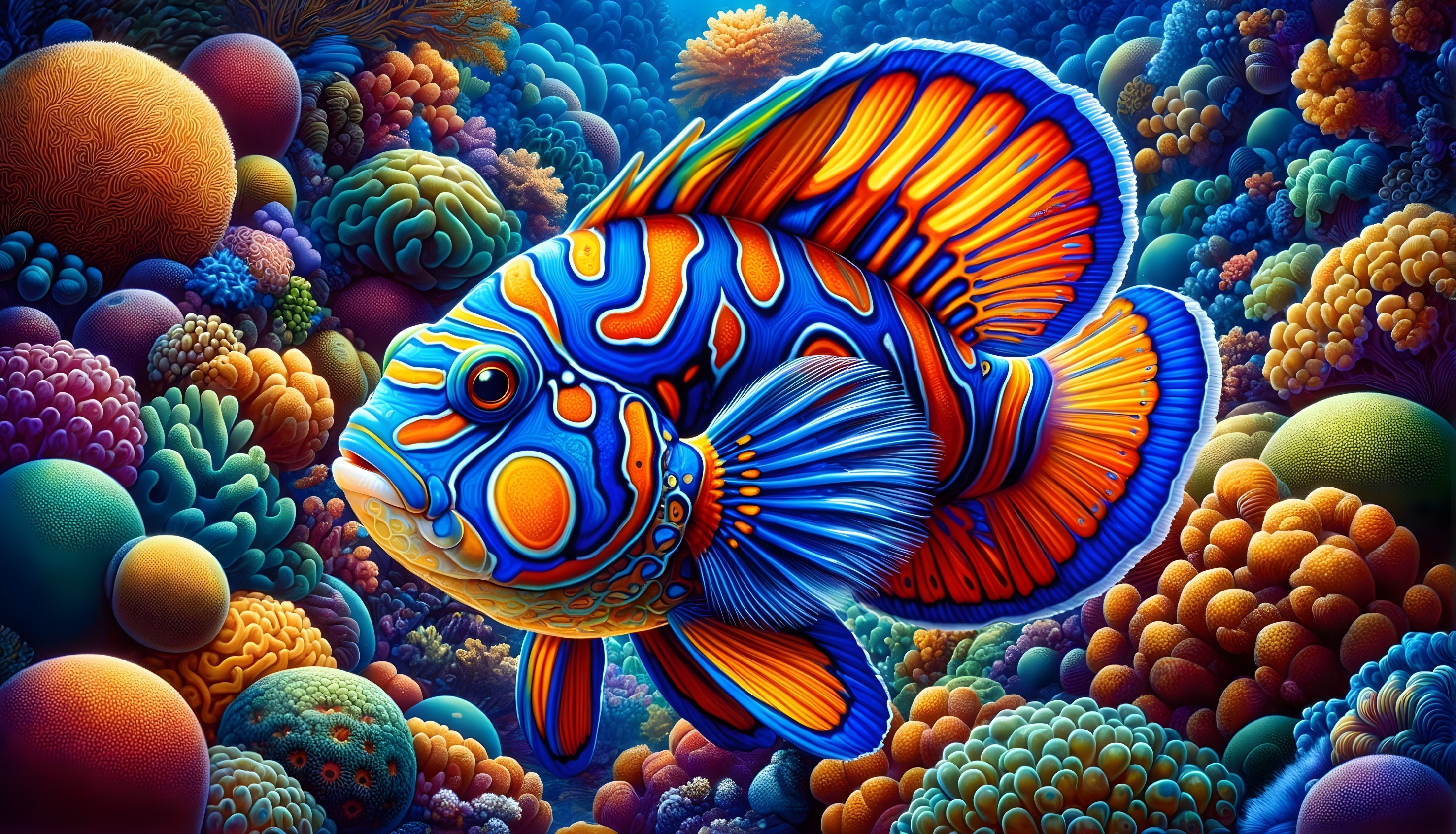 Mandarinfish Magic: A stunning close-up of a mandarinfish, renowned for its vivid colors and striking patterns, set against the backdrop of a vibrant coral reef. Drawing inspiration from Ernst Haeckel's detailed biological illustrations, the image captures the exquisite detail and natural beauty of this small, yet captivating, marine creature. The mandarinfish is the focal point, with its brilliant blue and orange patterns standing out prominently. The fish's scales exhibit an intricate mosaic of colors, with each hue blending seamlessly into the next. The mandarinfish's unique, delicate fins and subtle movements are captured, conveying a sense of grace and fluidity. Surrounding the mandarinfish, the coral reef is depicted in rich detail, showcasing a variety of coral formations and marine flora. The reef is alive with color, with a palette ranging from soft pastels to deep, saturated tones. This diverse environment provides a natural and complementary backdrop to the mandarinfish, highlighting its place in the ocean ecosystem. The lighting in the image plays a significant role, with rays of light filtering through the water, creating a dappled effect on the reef and the mandarinfish. This interplay of light and shadow adds depth and dimension to the scene, emphasizing the textures and forms of both the fish and its habitat. Overall, the image of "Mandarinfish Magic" is a celebration of the beauty and diversity of marine life. It provides a glimpse into the intricate world of coral reefs, showcasing the mandarinfish in its natural environment and highlighting the delicate balance and interdependence of ocean ecosystems.