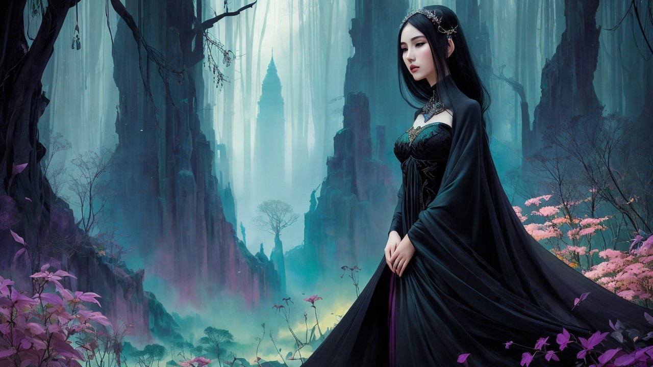 A serene, ethereal scene in a misty forest features a woman in a flowing black gown, surrounded by vibrant pink foliage. A mysterious figure stands in the distance, adding to the mystical atmosphere.