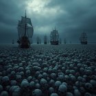 A vast ocean is dotted with numerous traditional sailboats, their white sails contrasting against dark clouds. The scene captures a sense of adventure and tranquility as boats navigate the serene waters.