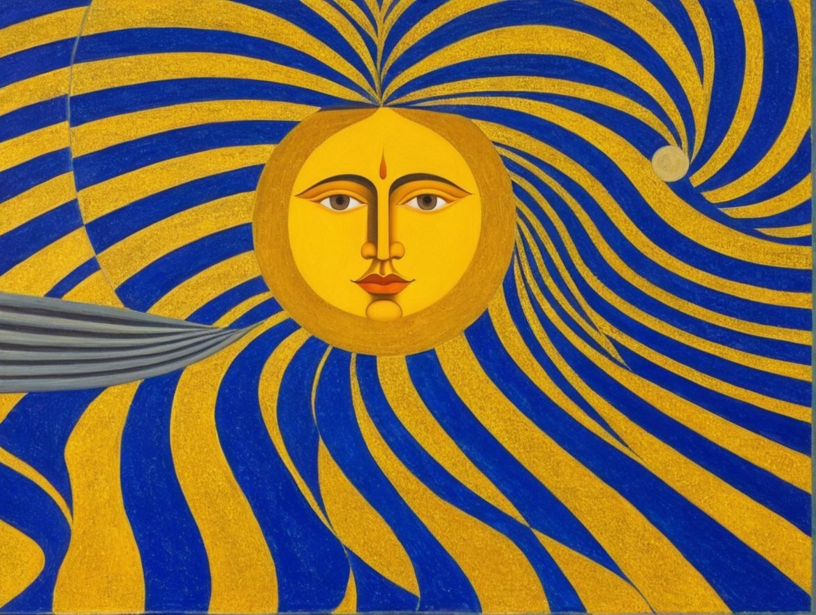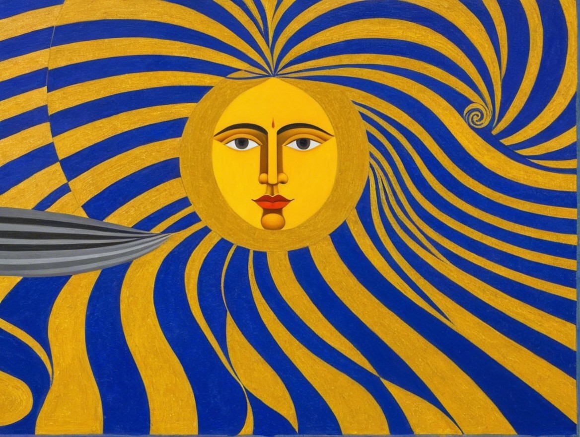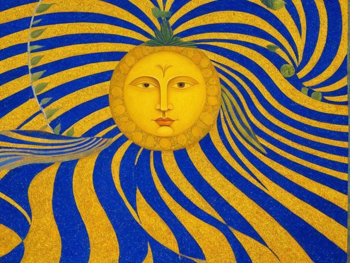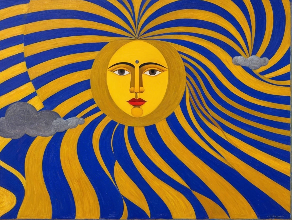 The artwork features a central sun with a face, surrounded by swirling blue and gold stripes. Two gray clouds add contrast, creating a vibrant, dynamic atmosphere.