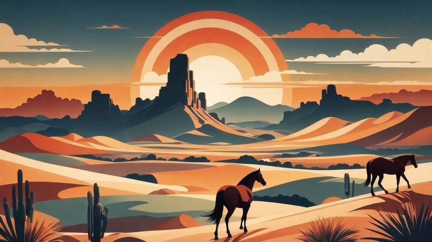 Stylized desert landscape at sunset with two horses, cacti, and a distant building against a large sun.